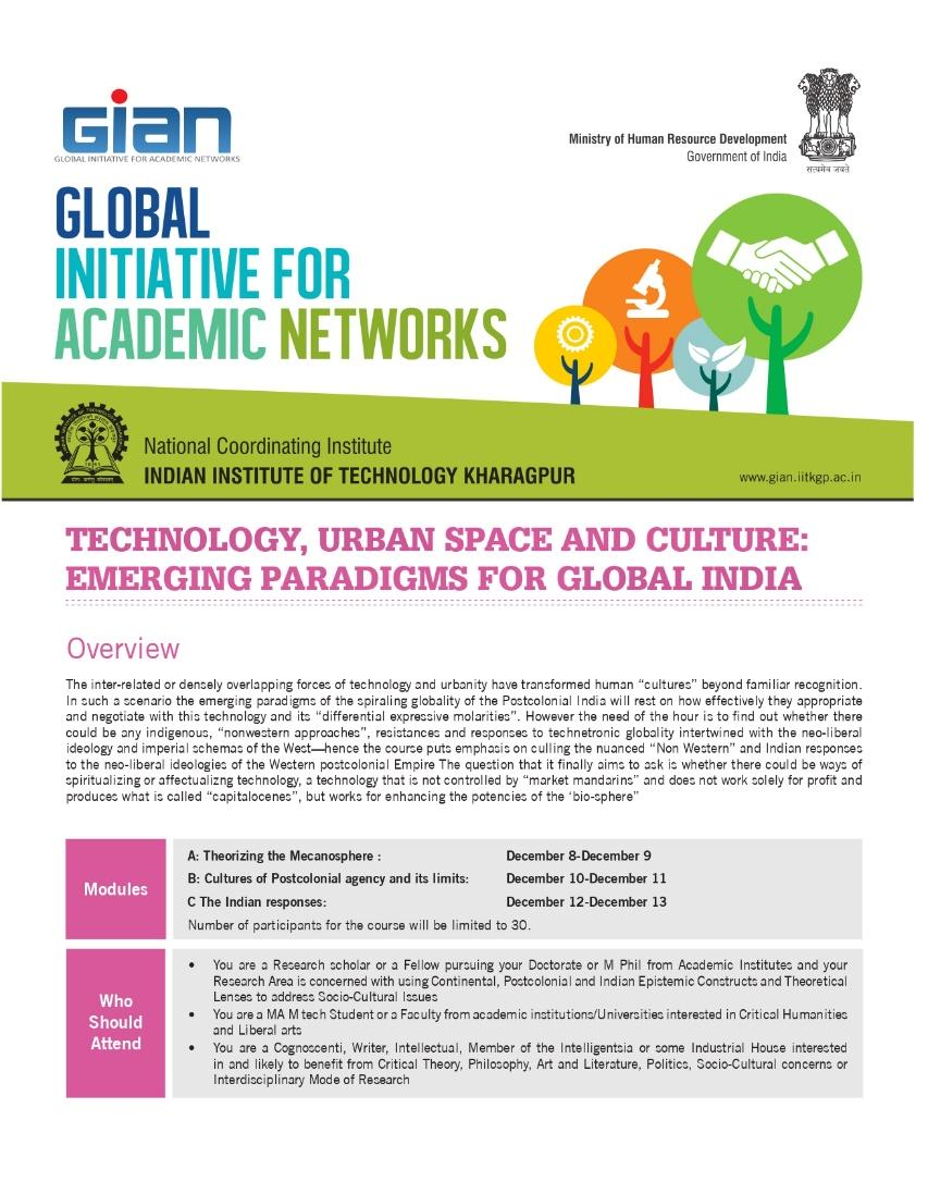 Technology, Urban Space and Culture: Emerging Paradigms for Global India (December 8th to 13th, 2017)